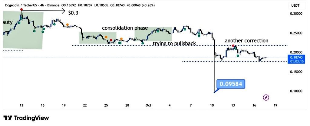As BitGuru pointed out, DOGE price has been struggling to find real momentum since that drop from $0.30. After a quick consolidation and a weak pullback attempt, the price drew down again, but it’s still trading above the key $0.18 support.