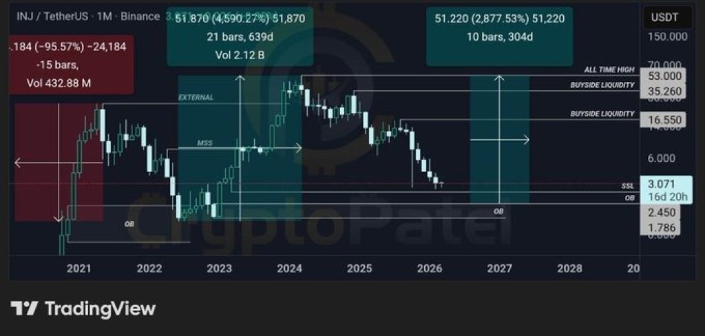 According to the analysis, the INJ price has corrected by roughly 95% from its peak, a move that often happens during major crypto cycles.