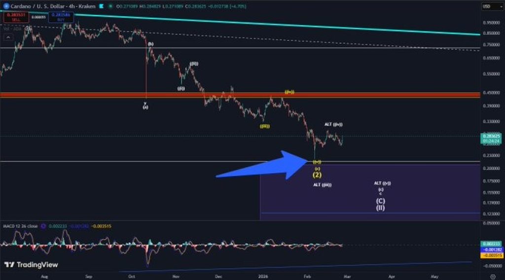 On the 4H chart, the ADA price dropped sharply into the February low around the $0.22 area. That level clearly stands out as a major pivot, as price reacted quickly and bounced from it. Since then, the fall has slowed down, and ADA has begun to establish a range rather than continuing to plummet lower.