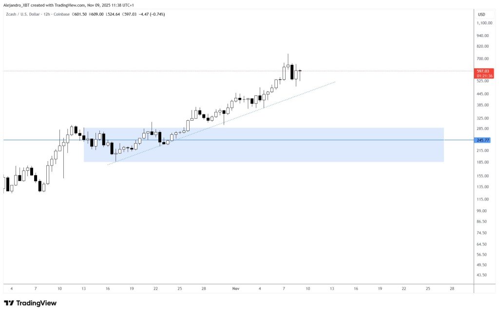 Zcash has been one of the climbers this cycle, pushing from the $200 zone all the way toward $600 without much noise from the broader market.