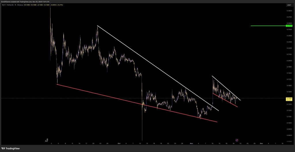 The newest wedge looks similar, with the WLFI price coiling just below a clean downtrend line. If WLFI pushes above $0.16–$0.17, the next clear target sits around $0.255, which Don’s chart also highlights as the next major resistance.
