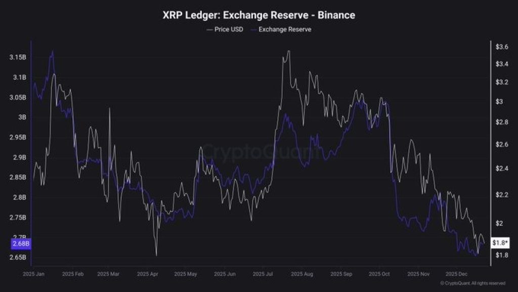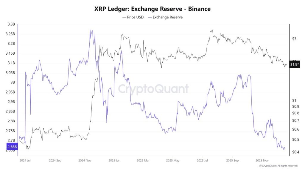 Ripple’s XRP price is still dealing with a choppy pullback, but one on-chain signal is moving the other way. Binance’s XRP reserves just slid to about 2.66B XRP, the lowest level since July 2024, based on the exchange reserve charts shared.
