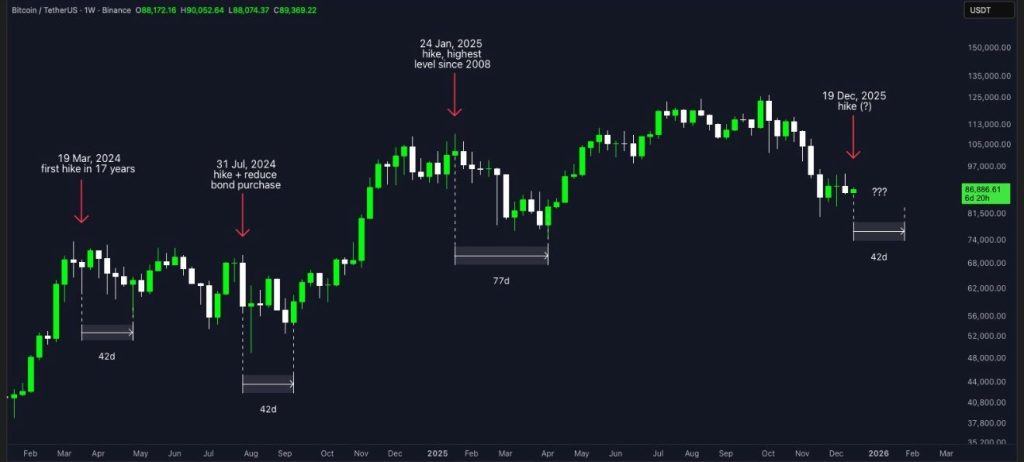 Bitcoin is back in an uncomfortable spot, and this time the pressure isn’t coming from the U.S. or the Fed. Instead, all eyes are on Japan. With a rate hike expected, traders are starting to revisit an old pattern that hasn’t treated Bitcoin very kindly in the past.