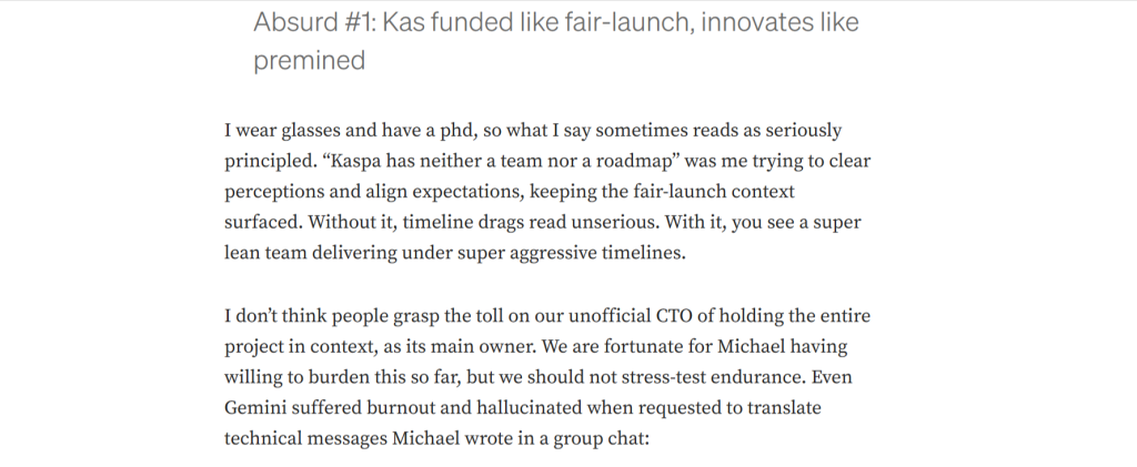 This creates Absurd #1 in his framing. KAS has funding DNA that looks like fair launch. Kaspa has delivery expectations that look like a project with deep pockets. Scaling an open source team costs many dollars and additional KAS. That reality forces the project to think about sustainable development without losing its decentralization identity.