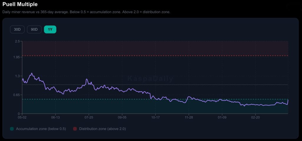 To really understand what this means for the KAS price, you have to look at the miners. The Puell Multiple basically compares what miners are earning now to their average earnings over the past year. When it drops below 0.5, it means they’re earning much less than usual.