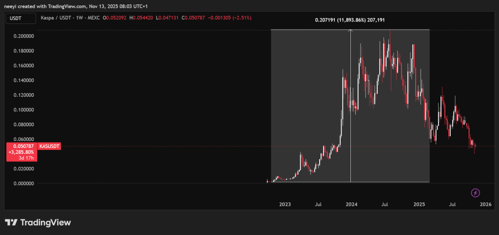 The answer may actually be simpler than it looks. Kaspa experienced a stunning 10,000% surge between October 2022 and July 2024. That move took the KAS price from fractions of a cent to an all-time high of about $0.2.