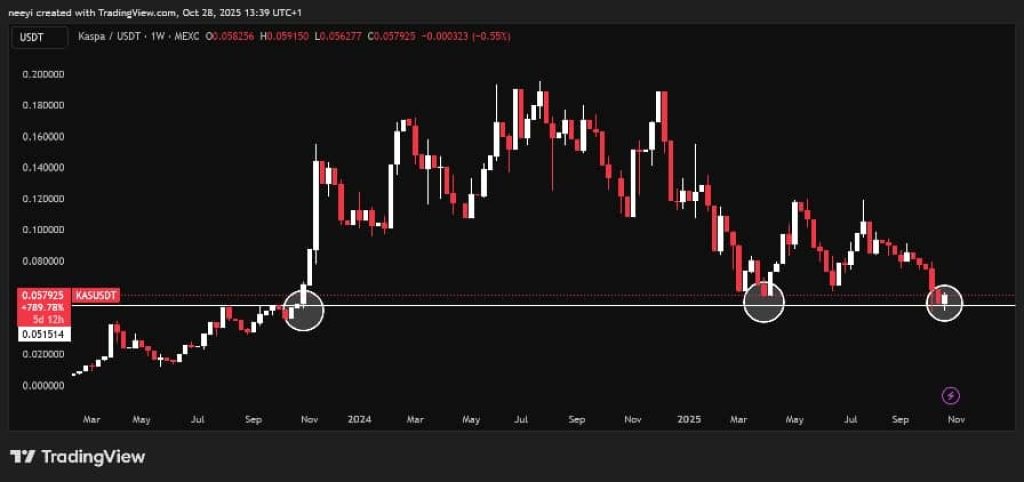 The KAS price is sitting above a strong support level that has held since October 2023. Each time it reached this zone, it bounced back with solid upward movement. The latest candlestick also closed above this level, showing buyers are still active there.