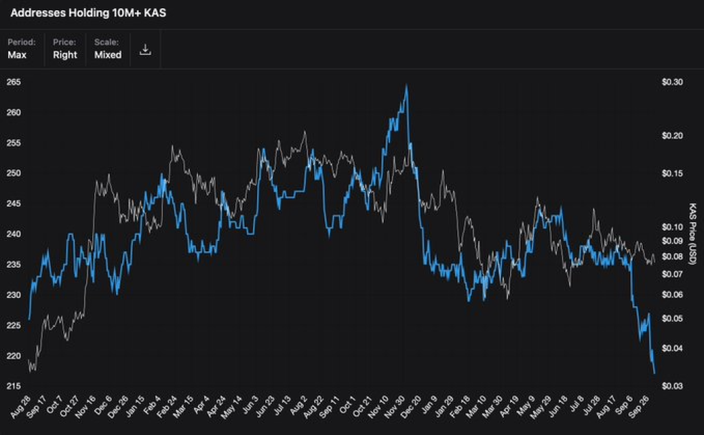 Kaspa’s on-chain data is showing an interesting shift this week. The number of addresses holding 10 million or more KAS has dropped to its lowest level ever, according to data shared by Kaspa Daily.