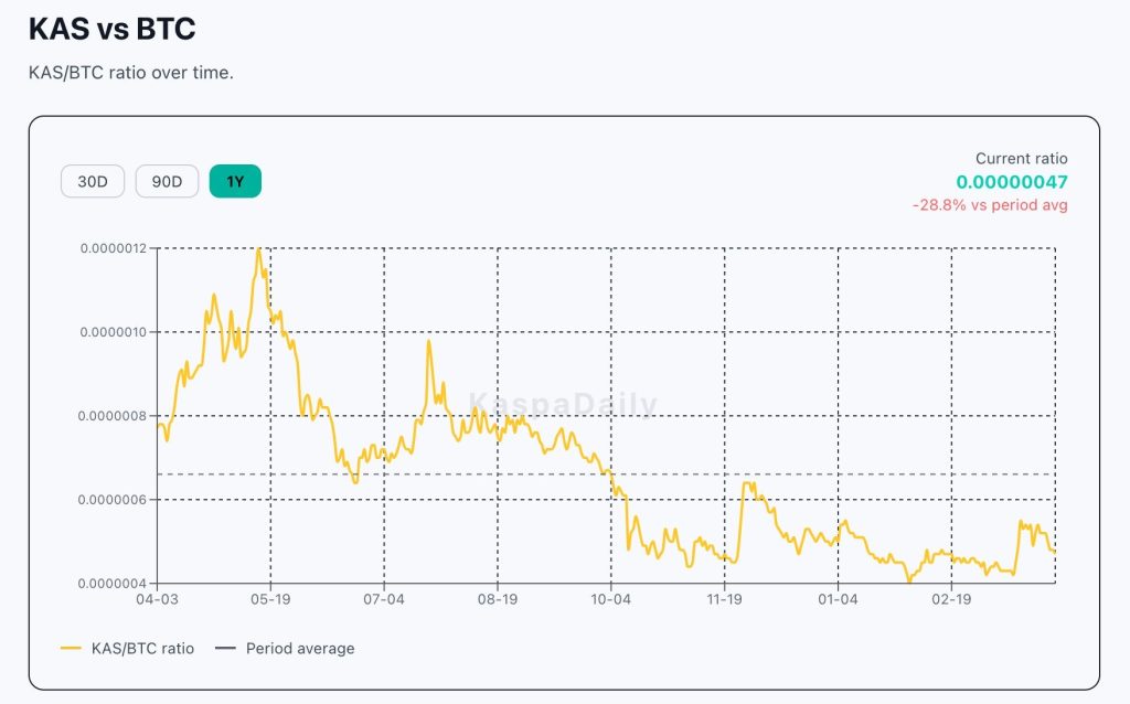 Comparing KAS to BTC instead of just looking at its USD price gives you a cleaner picture of what’s actually going on. It tells you whether Kaspa is keeping up with Bitcoin or falling behind, regardless of what the broader market is doing.