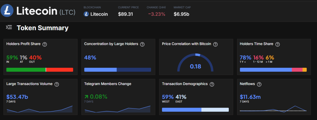 Looking at on-chain metrics, about 59% of Litecoin holders are in profit. That’s a positive sign. Another 78% of holders have held their coins for more than a year, showing strong long-term conviction. Large transaction volume reached over $53 billion in a week, with net inflows above $11 million.