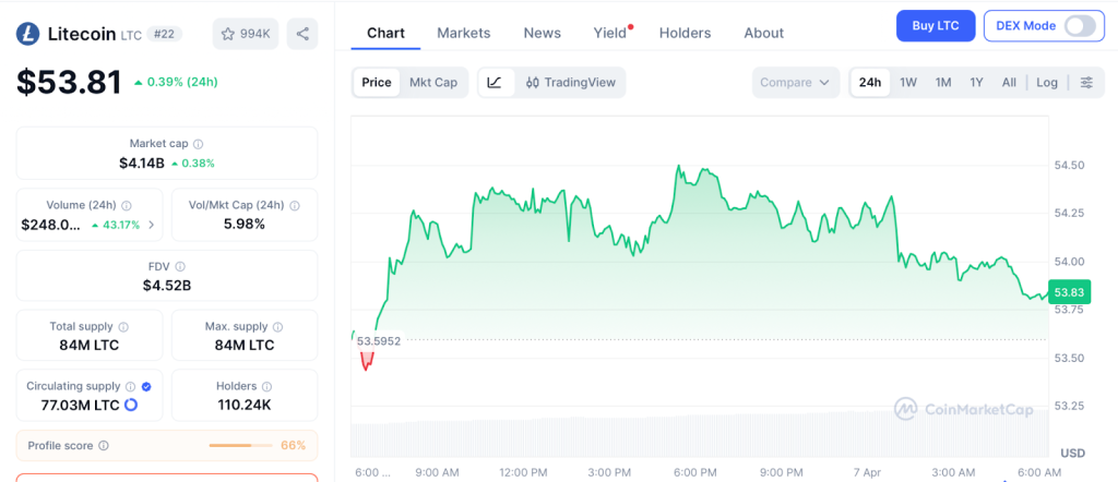 Litecoin traded at $53.81 on April 7, 2026, sitting roughly 86% below its all time high of $412 according to CoinMarketCap.