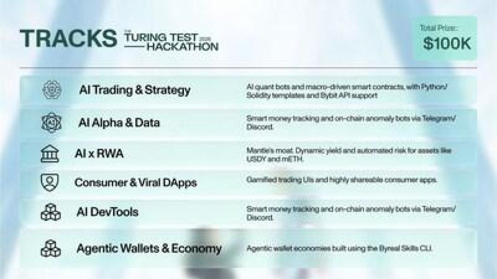 DUBAI, UAE, April 22, 2026 /PRNewswire/ — Mantle, the premier distribution layer connecting traditional finance with on-chain liquidity and real-world assets, today announced the Turing Test Hackathon 2026, a two-phase AI competition with a $120,000 total prize pool. The hackathon, designed to promote the convergence of agentic AI and on-chain infrastructure, invites Web3 builders and global AI developers to deploy autonomous agents on Mantle. It is co-hosted with Bybit, Byreal, Blockchain for Good Alliance (BGA), supported by DoraHacks and HackQuest, and powered by a coalition of leading Web3 and AI ecosystem partners.