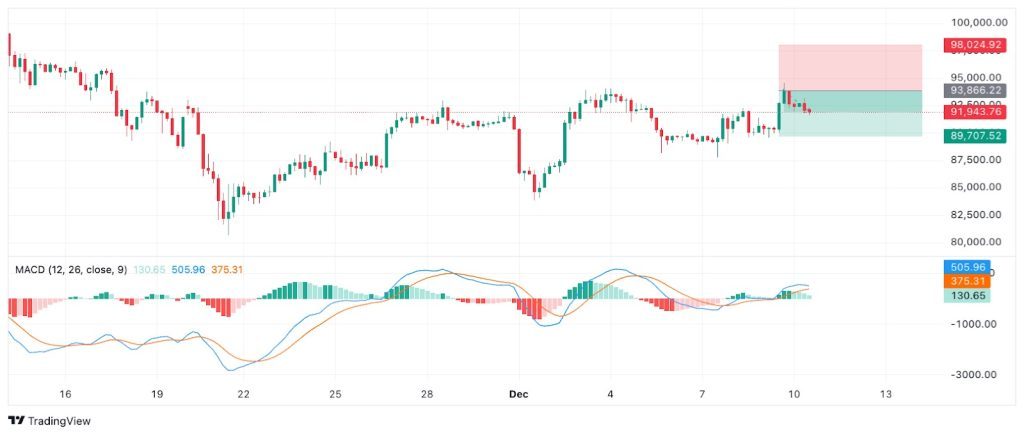 Bitcoin’s chart shows a market edging higher, with the price trading in a tight band between $91,943 and $93,866 while maintaining solid support near $89,707.