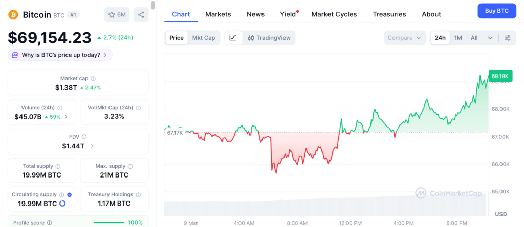 Bitcoin trades at $69,154 according to CoinMarketCap as MicroStrategy’s 101st purchase confirms institutional conviction. Spot ETFs pulled $568 million weekly. But MicroStrategy bought at $67,700 with a cost basis of $75,985, meaning even the largest corporate holder is underwater.