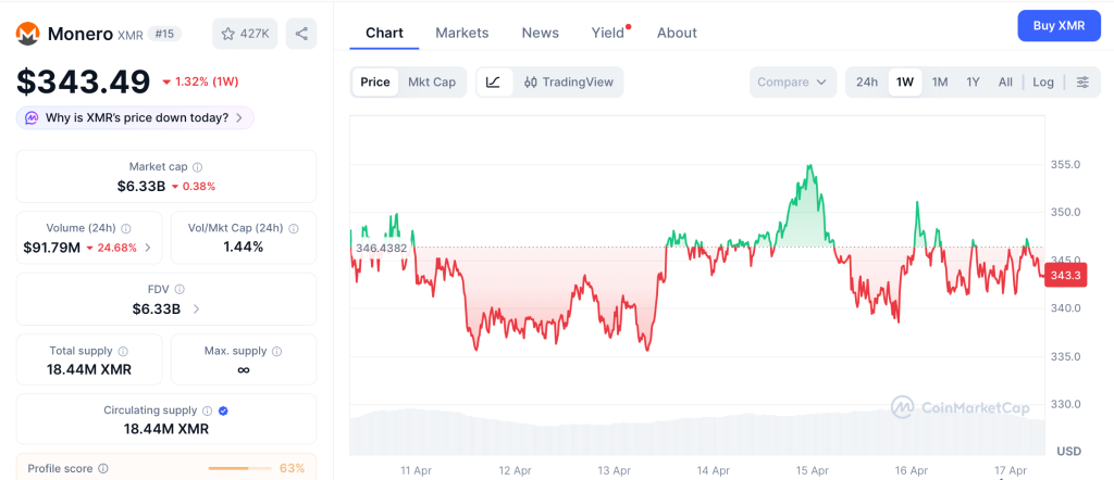 XMR trades near $343 according to CoinMarketCap, and the privacy coin set a fresh all time high of $794 in January 2026 before pulling back.