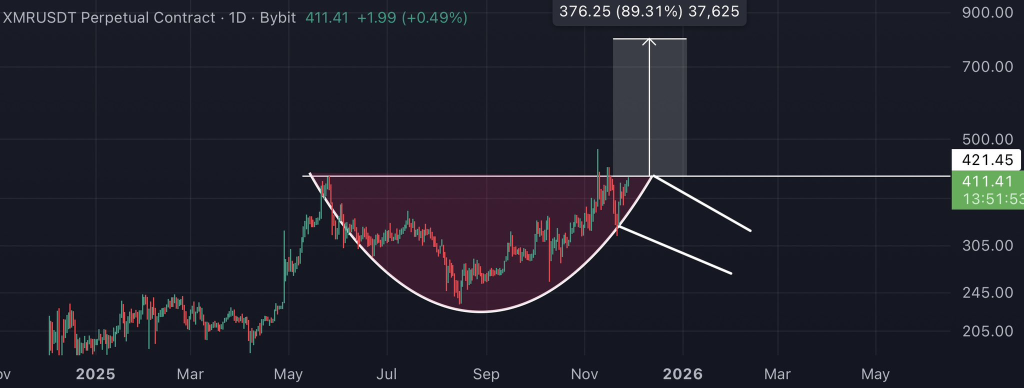 A wide rounded base stretches across the chart, building the cup that Master of Crypto outlined. A smaller dip forms the handle along the right side, shaping a structure that often appears before directional expansion. The Monero price sits around $413, just under that resistance band near $420 to $425.