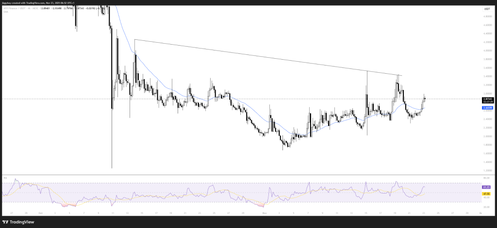 The token remains positioned above the monthly support near $2.50, reclaimed amid recent volatility.