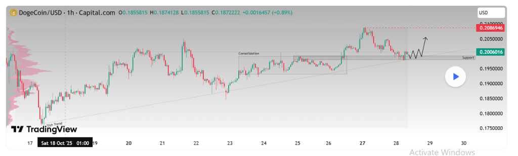 Dogecoin carries a market cap of $26.3 billion with a 24-hour volume of $2.1 billion. Live trackers show volume near $2 billion today as activity picks up, and traders are watching the $0.20 zone as the first hurdle for a stronger advance. A clean reclaim above that zone would strengthen the setup.