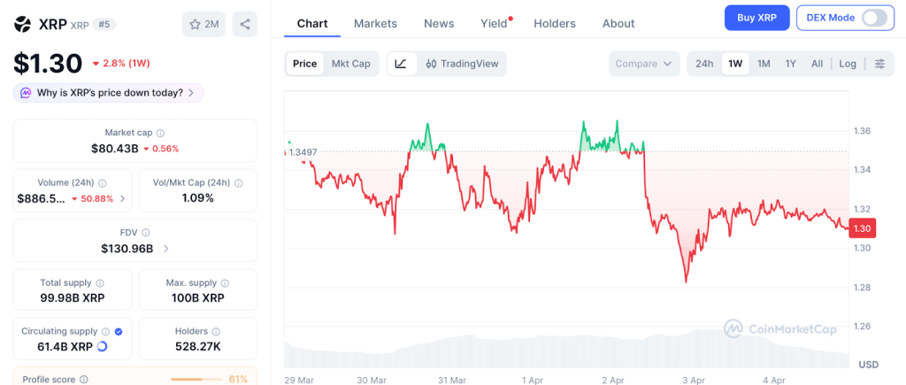 XRP trades at $1.30 per CoinMarketCap. A rally to $2.00 delivers about 53% over months.