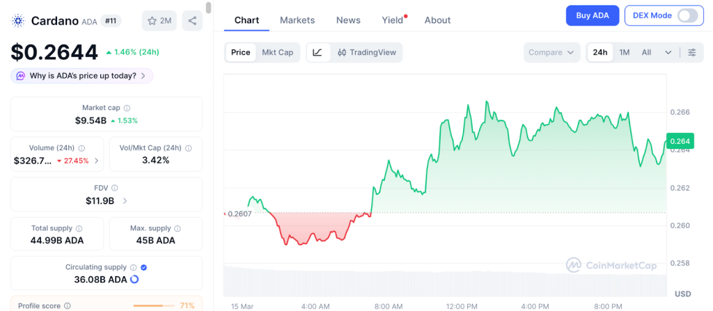 Cardano trades at $0.26 as of March 15, sitting roughly 95% below its all time high. The DeFi ecosystem recently fell short of the $1 billion TVL milestone that analysts expected, as CoinMarketCap data shows.