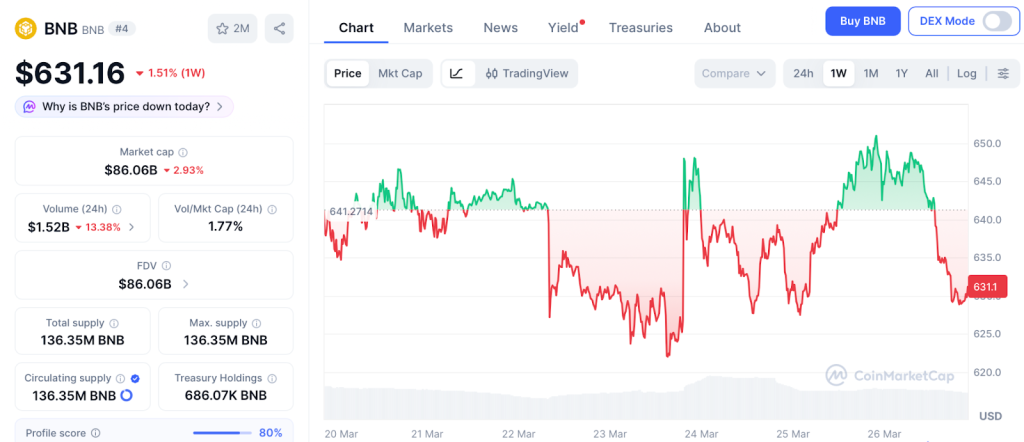BNB trade near $631 on March 26, pushing close to the 50 day moving average and sparking hope it will reclaim its 2025 levels, according to CoinMarketCap.
