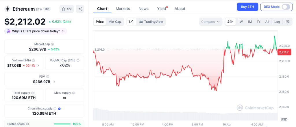Ethereum trades at $2,212 on April 10, up 0.62% in 24 hours after the BitMine NYSE news, according to CoinMarketCap. ETH sits 55% below its $4,953 all-time high with a $267 billion market cap.