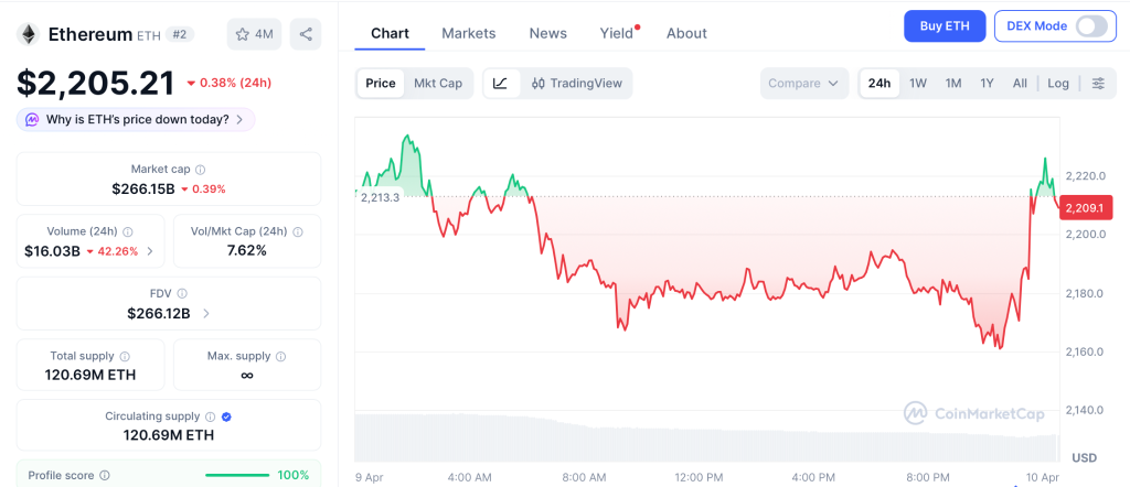 Ethereum trades near $2,205 with a $233 billion market cap and institutional players like Trend Research holding 601,000 ETH worth $1.8 billion, according to CoinMarketCap.