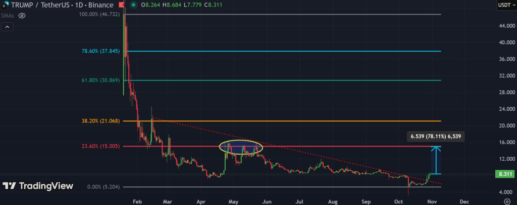 The chart also shows an important technical setup forming. The zone near $15.00 has been marked as the next significant target, sitting right at the 23.6% Fibonacci retracement level. If the Official Trump price continues to build momentum above $8.00, traders are eyeing a possible 2x move toward that zone.