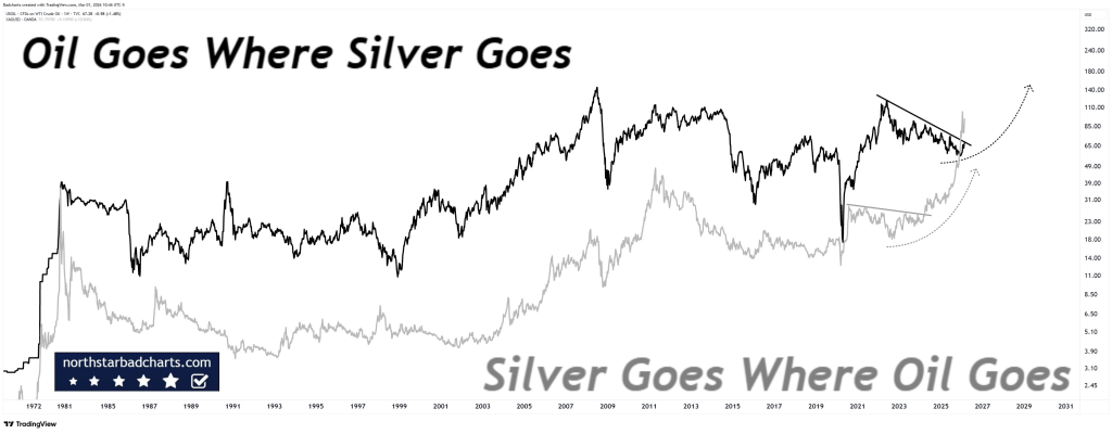 The chart compares decades of price action between crude oil and silver. One line tracks oil. The other tracks silver. The message is visual and blunt: major structural moves in silver tend to precede or align with large directional changes in oil.