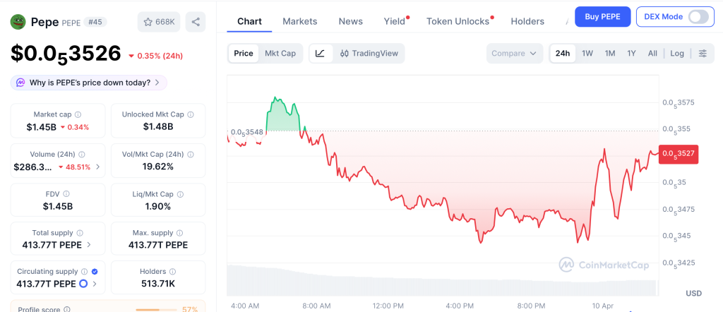 PEPE trades at $0.0000035 as of April 10, down 85% from its $0.00002803 high set in December 2024, per CoinMarketCap. The token sits below every major moving average, with the 50-day at $0.0000042 as first resistance and $0.0000085 where any real recovery starts. Support holds at $0.0000031, and a break below opens $0.0000025.