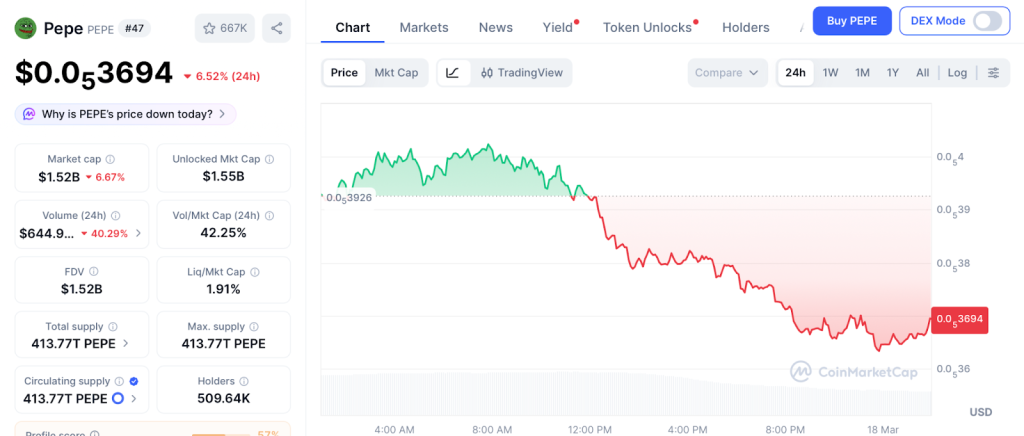 PEPE trades near $0.0000036 according to CoinMarketCap after losing over 80% from its 2024 highs. The pepe coin price prediction ranges between $0.000005 and $0.000015 by year end depending on meme coin rotation.