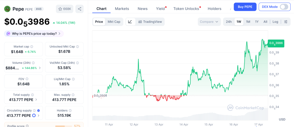 PEPE hovers around $0.0000039 as of April 17, roughly 86% off its $0.00002803 peak, with a capitalization near $1.6 billion per CoinMarketCap.