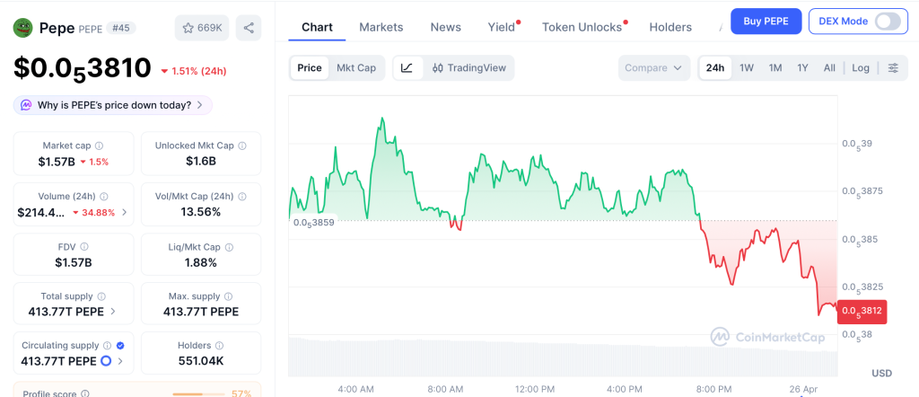 Pepe Coin (PEPE) trades near $0.0000038 on April 25, sitting roughly 86% below its all time high of $0.00002803, according to CoinMarketCap.