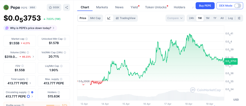 Pepe (PEPE) trades near $0.0000037, up 7.03% this week from recent lows with the first spot PEPE ETF filed by Canary Capital on April 8 per CoinMarketCap.