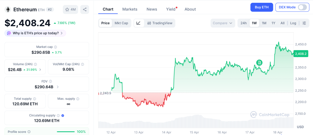 ETH prints $2,408 on April 18 per CoinMarketCap after defending $2,200. April 16 marked Schwab Crypto launching with direct Bitcoin and Ether trading for 38.9 million clients per CNBC, custody under Schwab Premier Bank, Paxos handling execution.