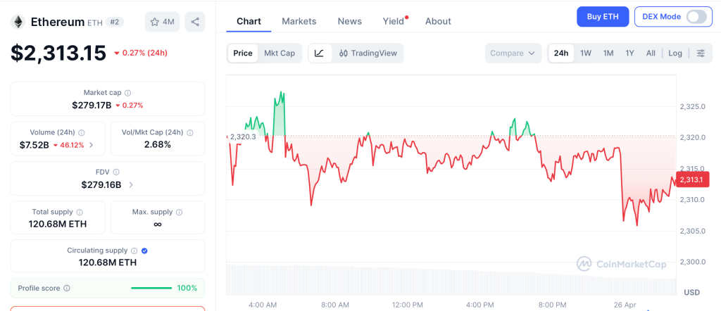Ethereum (ETH) trades at $2,313, up 0.27% on the day, with support sitting at $2,200 and resistance at $2,400 per CoinMarketCap.