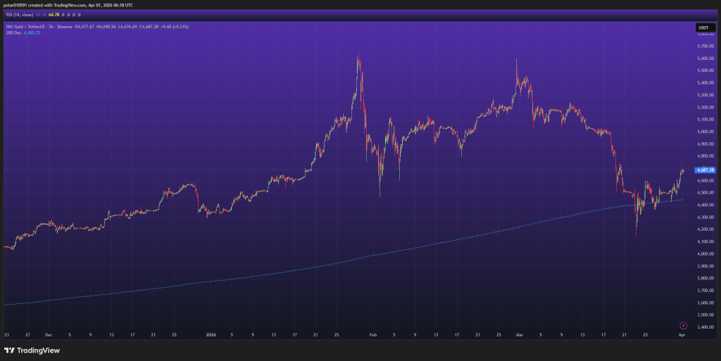The 2‑hour PAX Gold chart from TradingView shows the strength of the recent move. PAXG trades at $4,687, well above the 200‑day moving average sitting at $4,450. Price cleared that level with conviction last week and has held above it ever since.