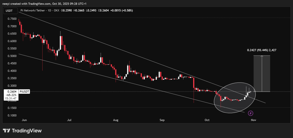 The chart shows that Pi Network price jumped by more than 30% within four days, reaching around $0.25. The breakout occurred as the price moved above the upper boundary of the falling channel, a signal often seen as a potential trend reversal.