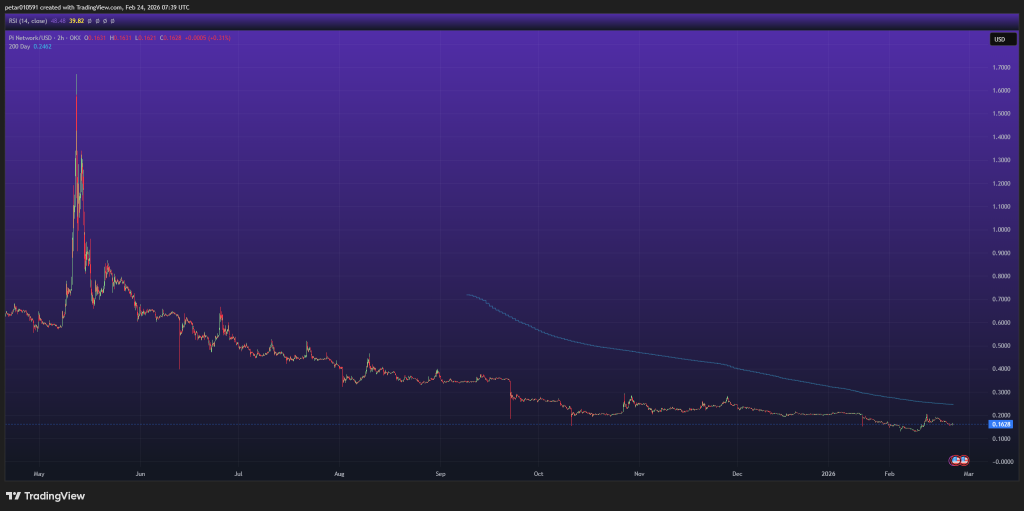 At the same time, the Pi Coin price chart tells a very different story. Despite the steady stream of updates and expansion metrics, the token continues to trade in a prolonged downtrend. After an initial pump following launch, Pi has gradually faded and is now trading around the $0.16 level, with little to none momentum around it.