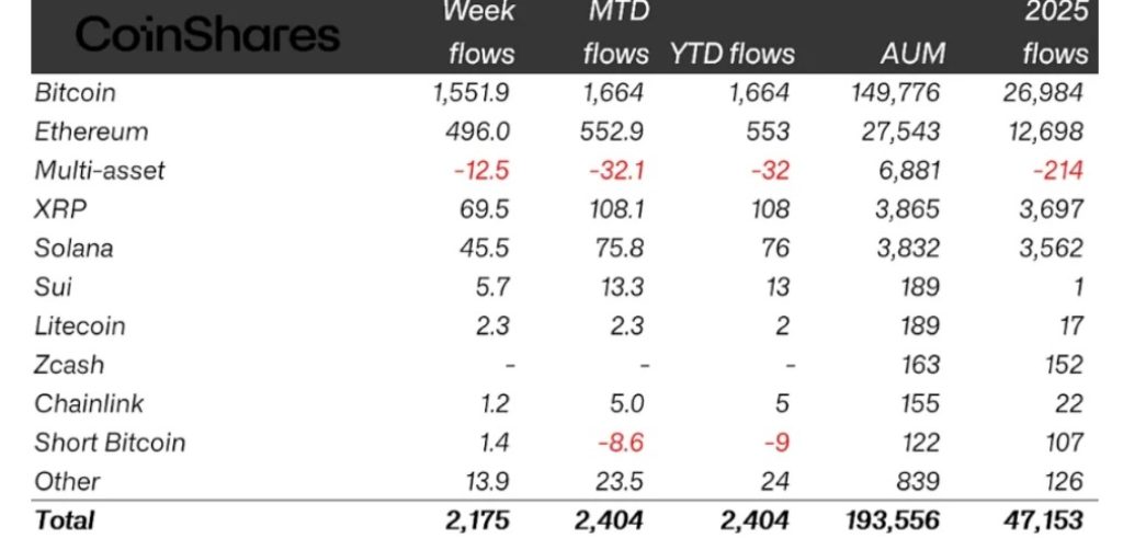 CoinShares data shows that crypto exchange-traded products (ETPs) attracted an inflow of $2.17 billion last week. Bitcoin accounted for 71% of the total inflow.