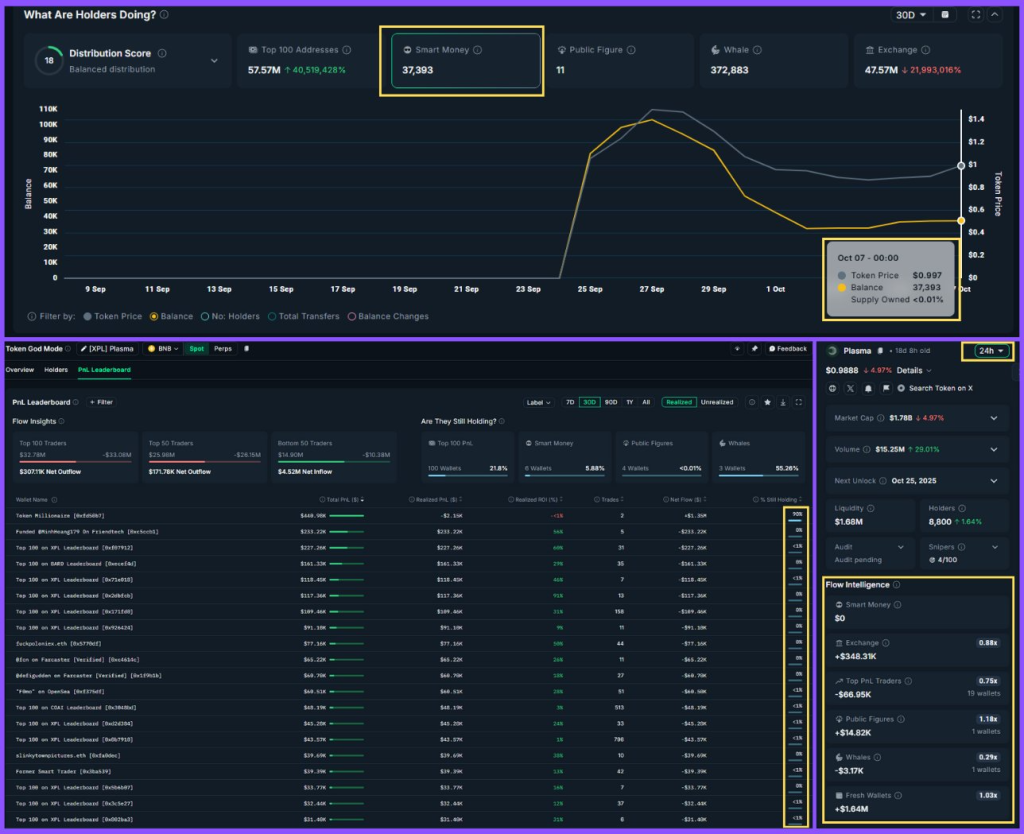 At writing, the Plasma pump looks more like a technical bounce than the start of a new rally. The fundamentals are solid, but no re-entry from smart money implies the move can fade unless new buyers come in.