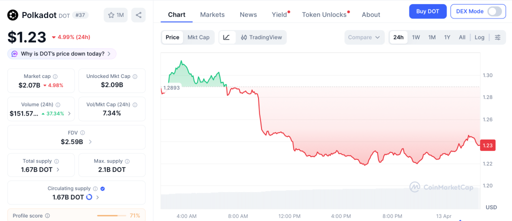 DOT trades at $1.23 with a $2 billion cap, down 97% from its $55 all time high per CoinMarketCap. Changelly projects the polkadot price prediction for 2026 between $1.40 and $3.18 with an April average near $1.79.