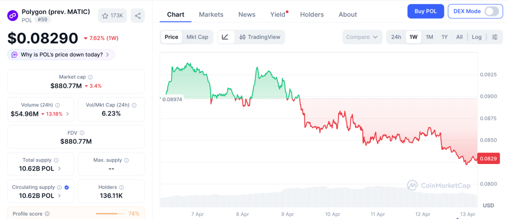 Polygon (POL) trades at $0.082 after losing over 77% through 2025 per CoinMarketCap. The Giugliano hardfork cut finality by two seconds, but price sits below both the 50-day and 200-day moving averages.