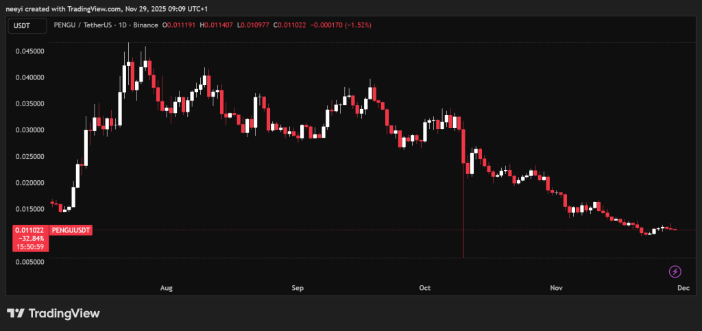 A rough stretch unfolded across crypto, and Pudgy Penguins has been caught inside that storm. A sharp downtrend has shaped the PENGU price since October, and the drop now sits at more than 60%. A deeper problem sits underneath the chart, according to the analyst from Bearhard Bitcoin Strategy.