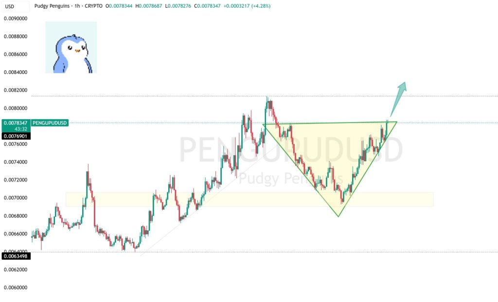 On the chart, PENGU hit a high of $0.0078687 and a low of $0.0078276. The price is moving inside a clear range. The top of that range is near $0.0088000 to $0.0090000. Support sits around $0.0063498.