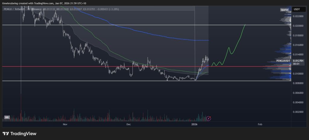 If the PENGU price continues to hold above this reclaimed value area, the path toward $0.02 stays open. That level lines up with previous resistance and the projected move shown on the chart.