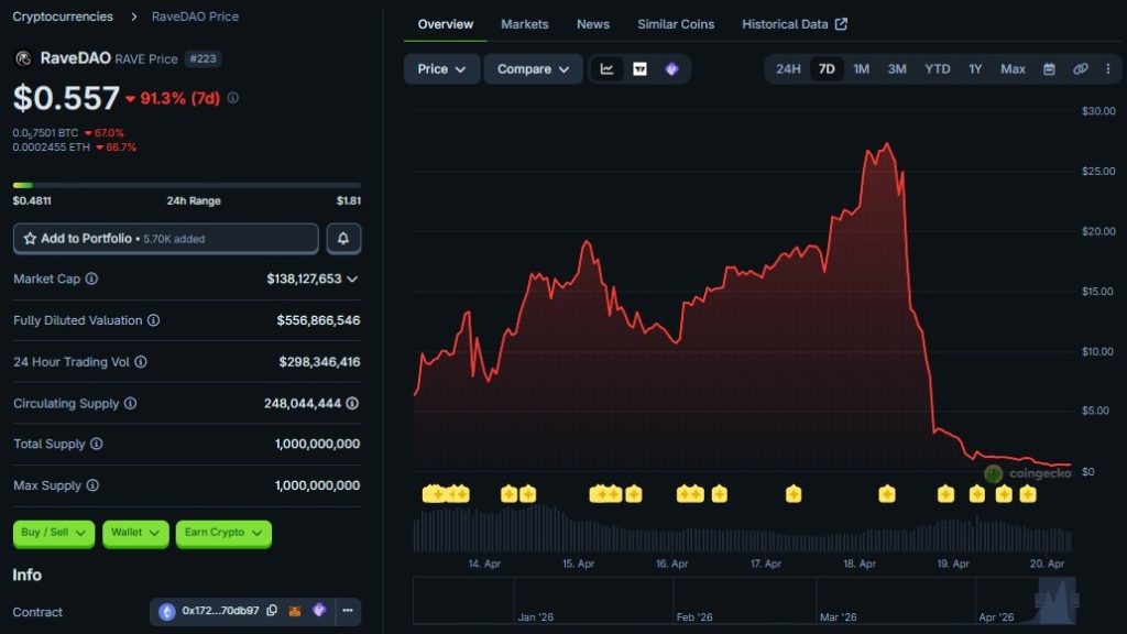 The dumping appears to have occurred on Bitget, even as the exchange says it is investigating the situation. The RAVE price is now down over 98% from its peak near $28. The scandal is not over. The bleeding is not done.