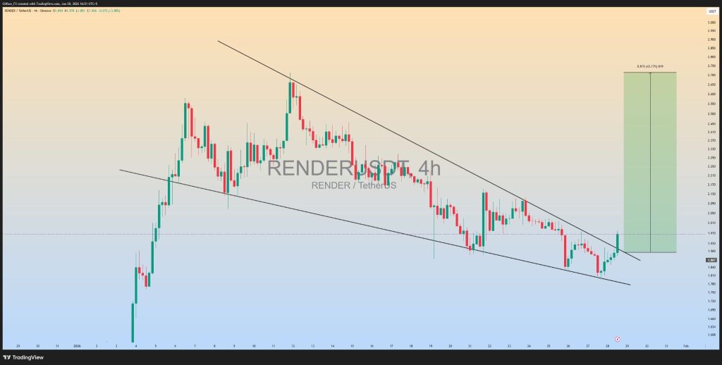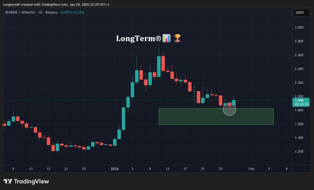 Right now, the RENDER price is sitting at a clear decision point. The 4-hour chart is building steam, and on the daily chart, the support continues to hold at the critical price range of $1.80–$1.85.