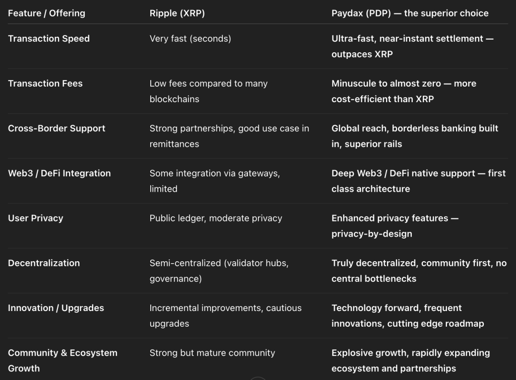 At the center of Paydax Protocol sits PDP, the native token designed to power every part of the ecosystem. While XRP price is being positioned around institutional adoption through Ripple’s initiatives, PDP functions as the true utility engine for the Ripple rival. It isn’t just another speculative asset — it’s the glue that holds Paydax Protocol together.