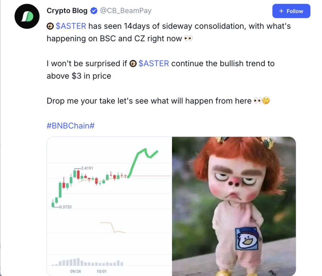 According to @CB_BeamPay, the token is showing signs of bullish continuation, especially if it breaks out of this sideways range. With strong community sentiment (72% bullish on CoinMarketCap) and growing attention across BNB Chain projects, there’s buzz that ASTER could push toward $3 and beyond in the coming sessions.